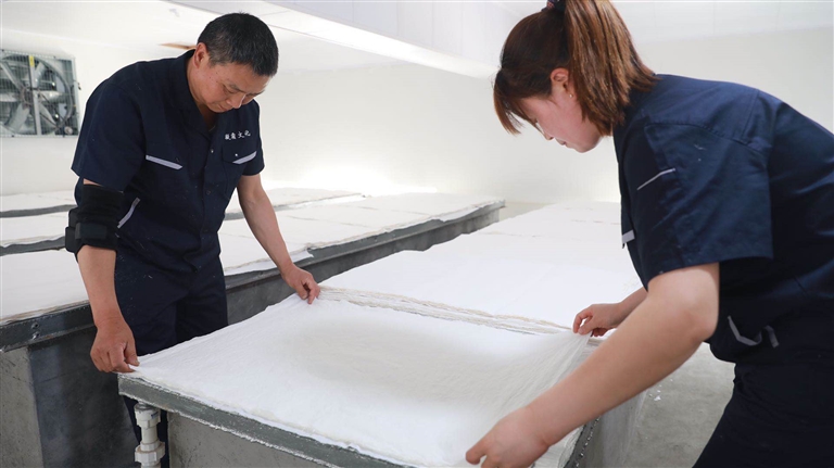 10月9日下午,縣長吳云忠赴海陽鎮(zhèn)凝霜文化發(fā)展公司調(diào)研徽州楮皮紙傳承與發(fā)展工作,縣委常委、海陽鎮(zhèn)黨委書記金學(xué)年,縣委常委、縣政府副縣長程衛(wèi)華參加調(diào)研活動。 吳云忠一行實地察看了徽州楮皮紙生產(chǎn)工藝流程,認真聽取企業(yè)負責(zé)人介紹,詳細詢問徽州楮皮紙制作工藝